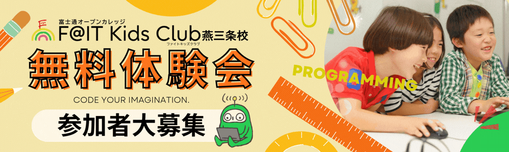JR燕三条駅から徒歩2分にある、プログラミング教室「富士通オープンカレッジ燕三条校(F@IT Kids Club燕三条校)」。同建物内で、シニア向けパソコン教室、iPad 教室、公共職業訓練など、様々な教育サービスを提供しています。