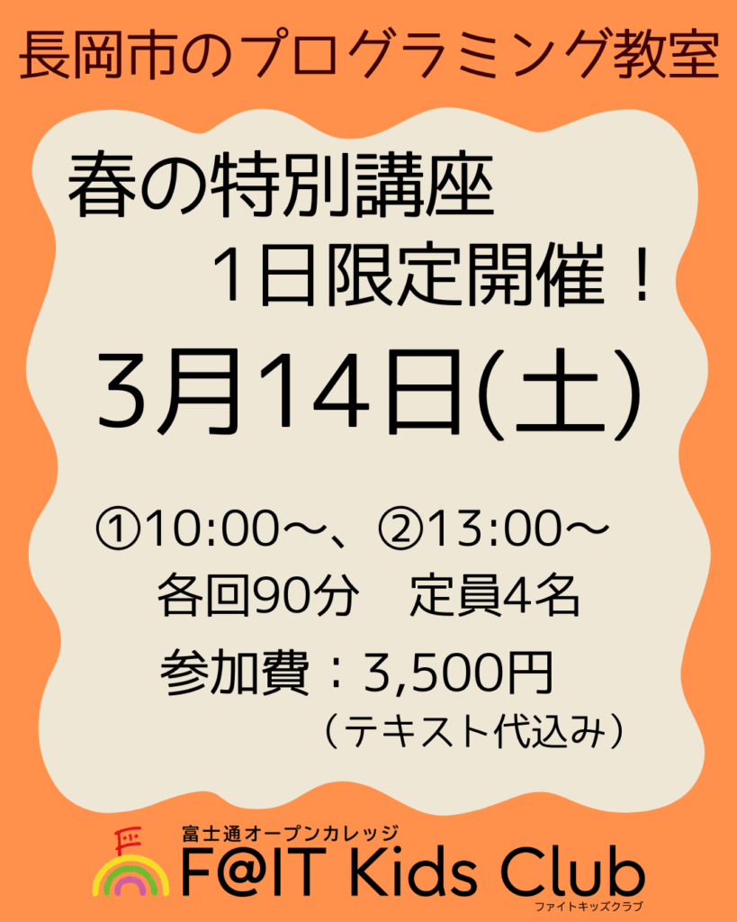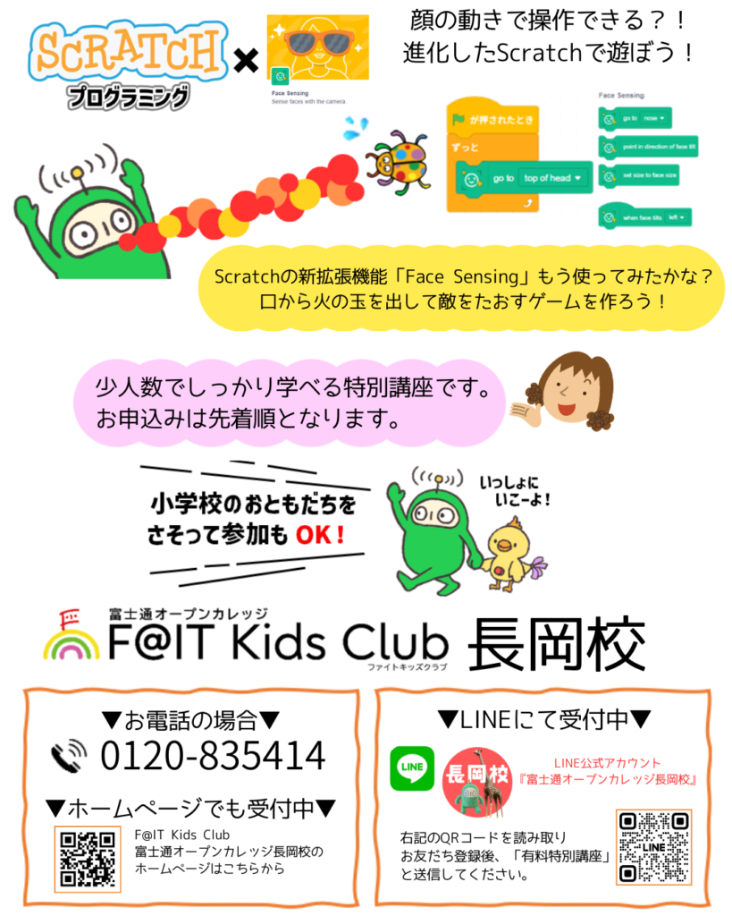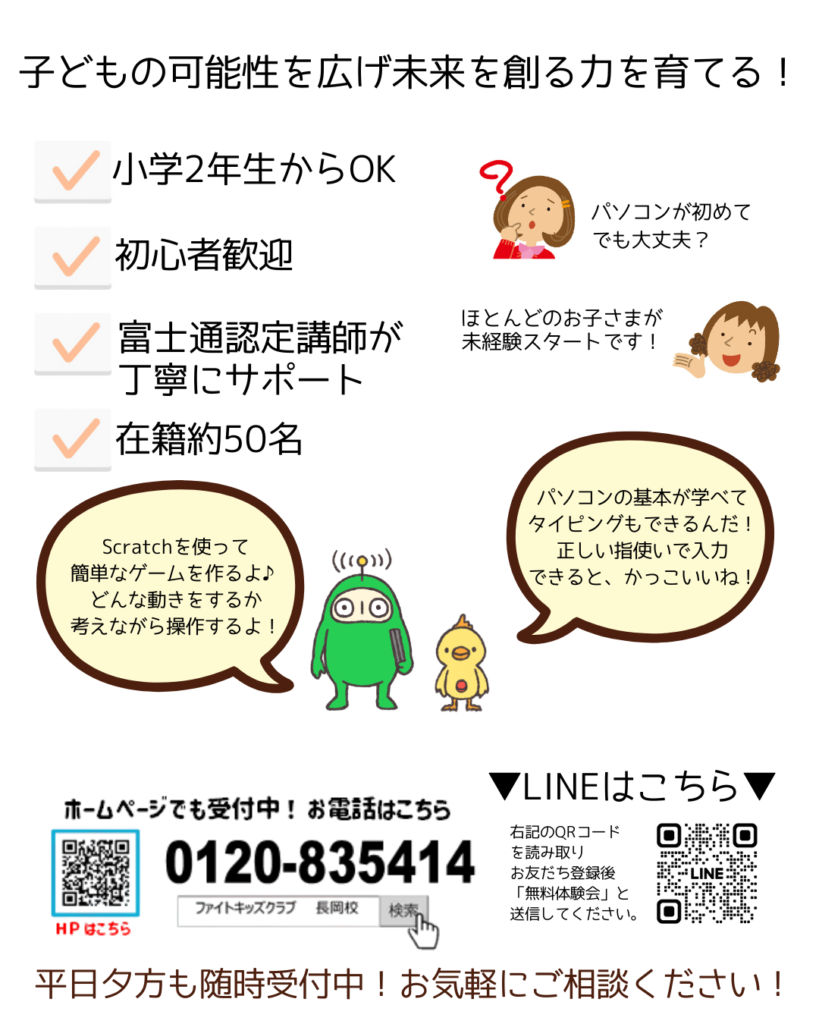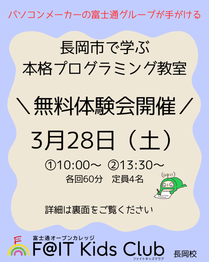 『富士通発プログラミング教室 F@IT Kids Club 長岡校』は、随時見学可能です。